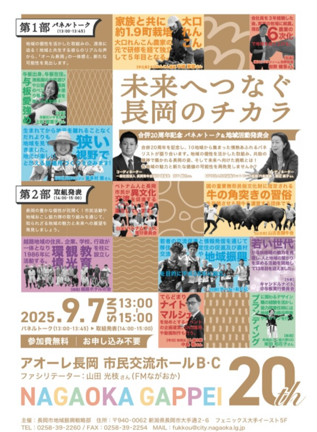 長岡市合併20周年パネルトーク登壇 2025 11/24 活動報告 2025年9月7日 2025年11月24日 地域おこし協力隊として所属している中島隊員が合併20周年パネルトークにて、波音の活動や紹介を行いました。他地域の方々や学生など50名ほどの方々に波音をアピールしてきました。今後の活動もよろしくお願いします。 活動報告 よかったらシェアしてね! URLをコピーしました! URLをコピーしました! 第3回てらどまナイトマルシェ開催 『疲れた海をリセット』悠久ライオンズクラブ様と長岡技術科学大学様の企画をサポートさせていただきました 関連記事 『疲れた海をリセット』悠久ライオンズクラブ様と長岡技術科学大学様の企画をサポートさせていただきました 2025年10月11日 伊勢崎市・寺泊地域マリンスポーツ交流会に参加させていただきました 2025年7月26日 寺泊中学校ビーチクリーン 2025年6月27日 全国高校生マイプロジェクトAWARD2024 新潟県summitの報告会&懇親会 2025年6月21日 キレイミライプロジェクトin野積海水浴場(【主催】特定非営利活動法人Lily&Marry’S) 2025年6月21日 ◇地域おこし協力隊着任のお知らせ◇ 2025年5月1日 サンタクロース派遣事業 2024年12月24日 佐渡へ視察に行きました! 2023年3月12日